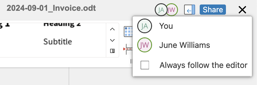 Clicking the user icons, display a list of users who are currently viewing or editing the document.