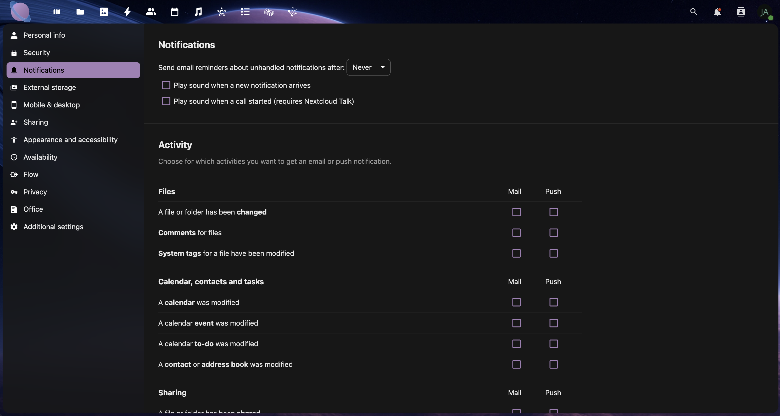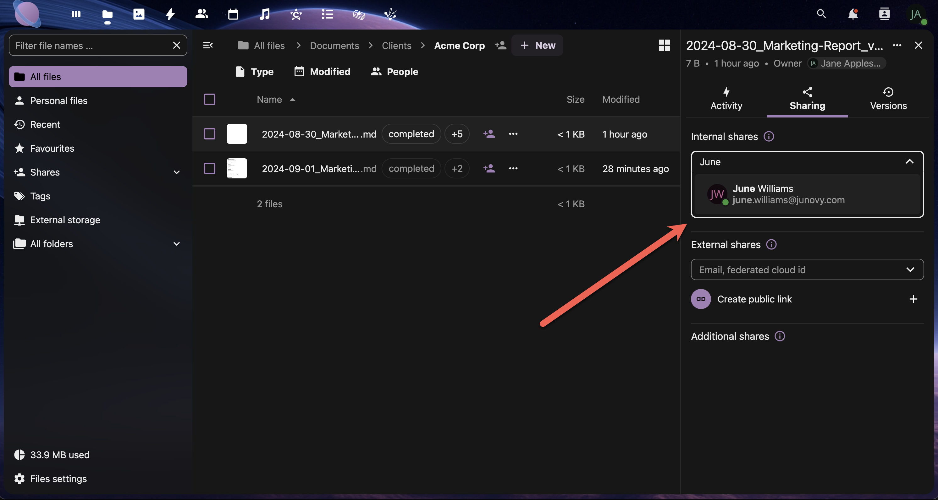 Internal Sharing: Share with other Junovy Cloud Storage users Link Sharing: Create shareable links for external access Email Sharing: Send files directly via email Group Sharing: Share with predefined user groups Federated Sharing: Share with users on other NextCloud instances