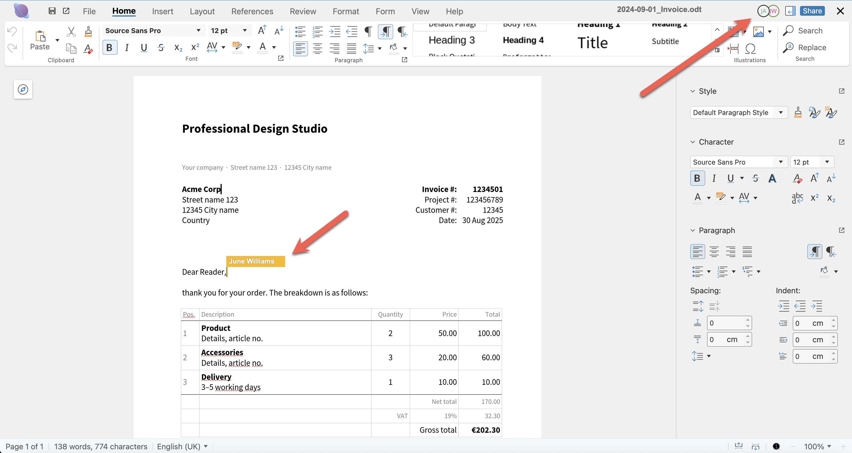 When more than two users have a file open, the other user's cursor will display with their name. If the document has been opened by more than one user, this will be shown in the upper right-hand corner of the screen.