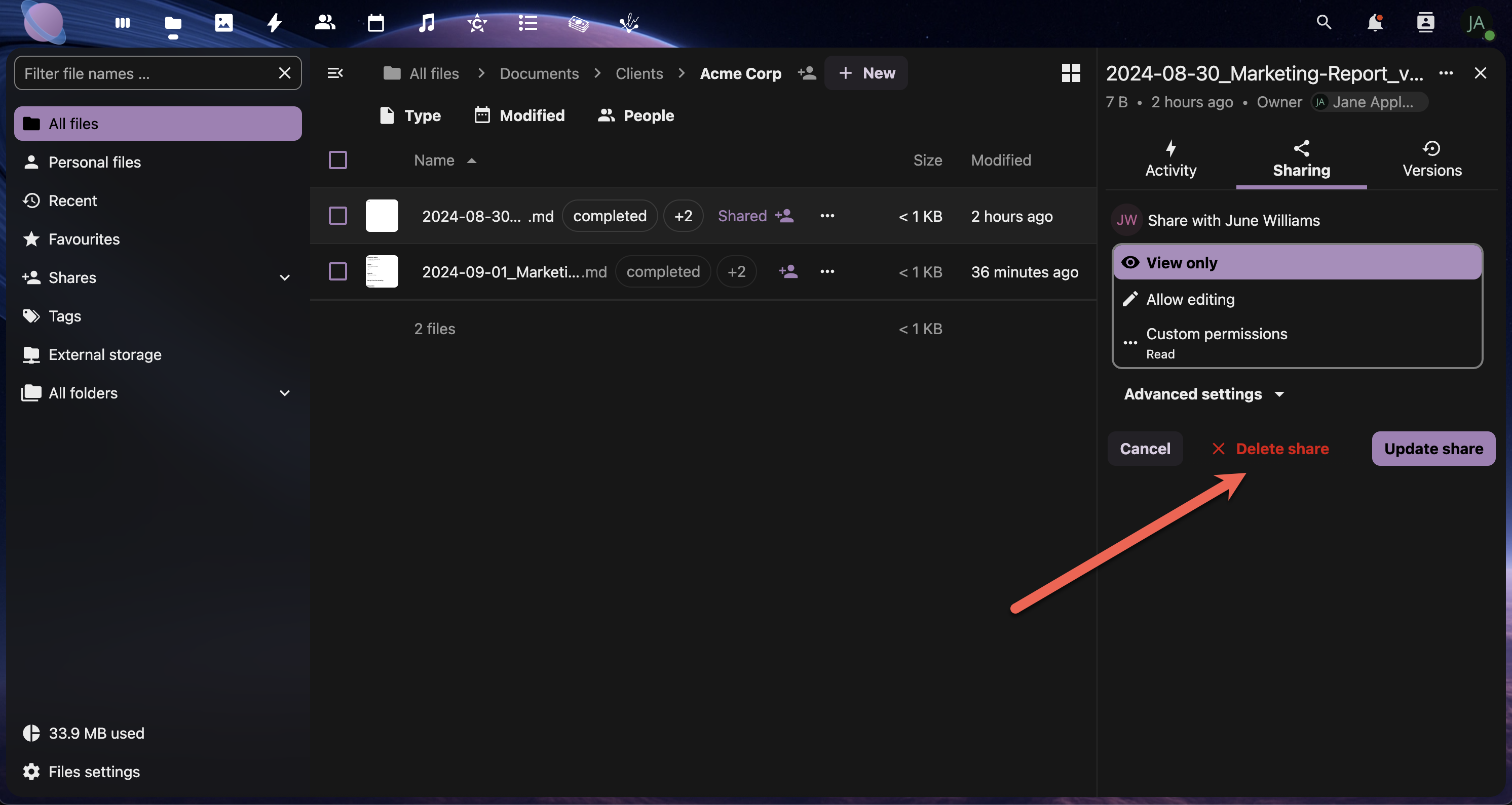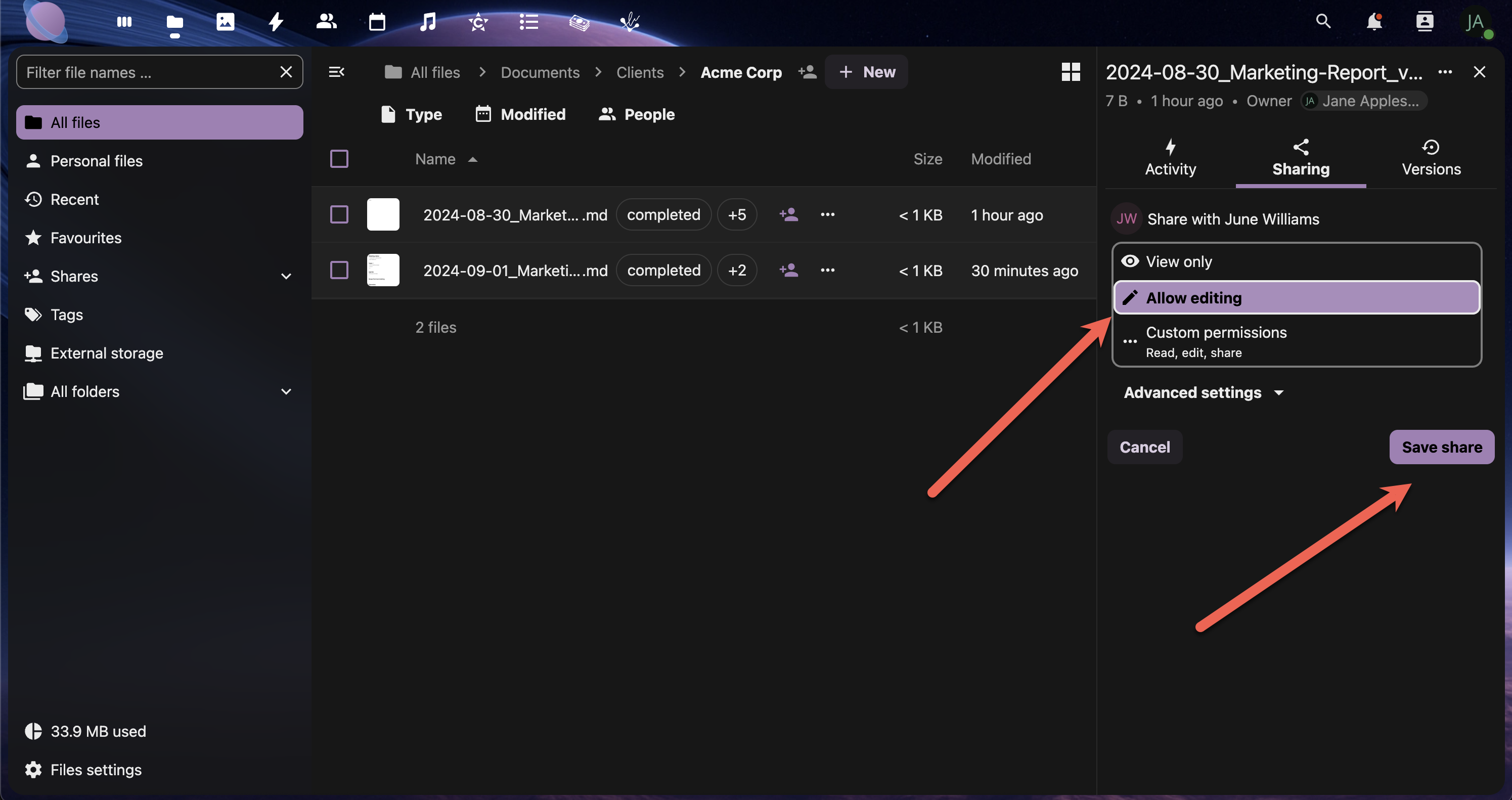 Once the user is selected, choose between View only, Allow editing, or Custom Permissions. Then click Save share.