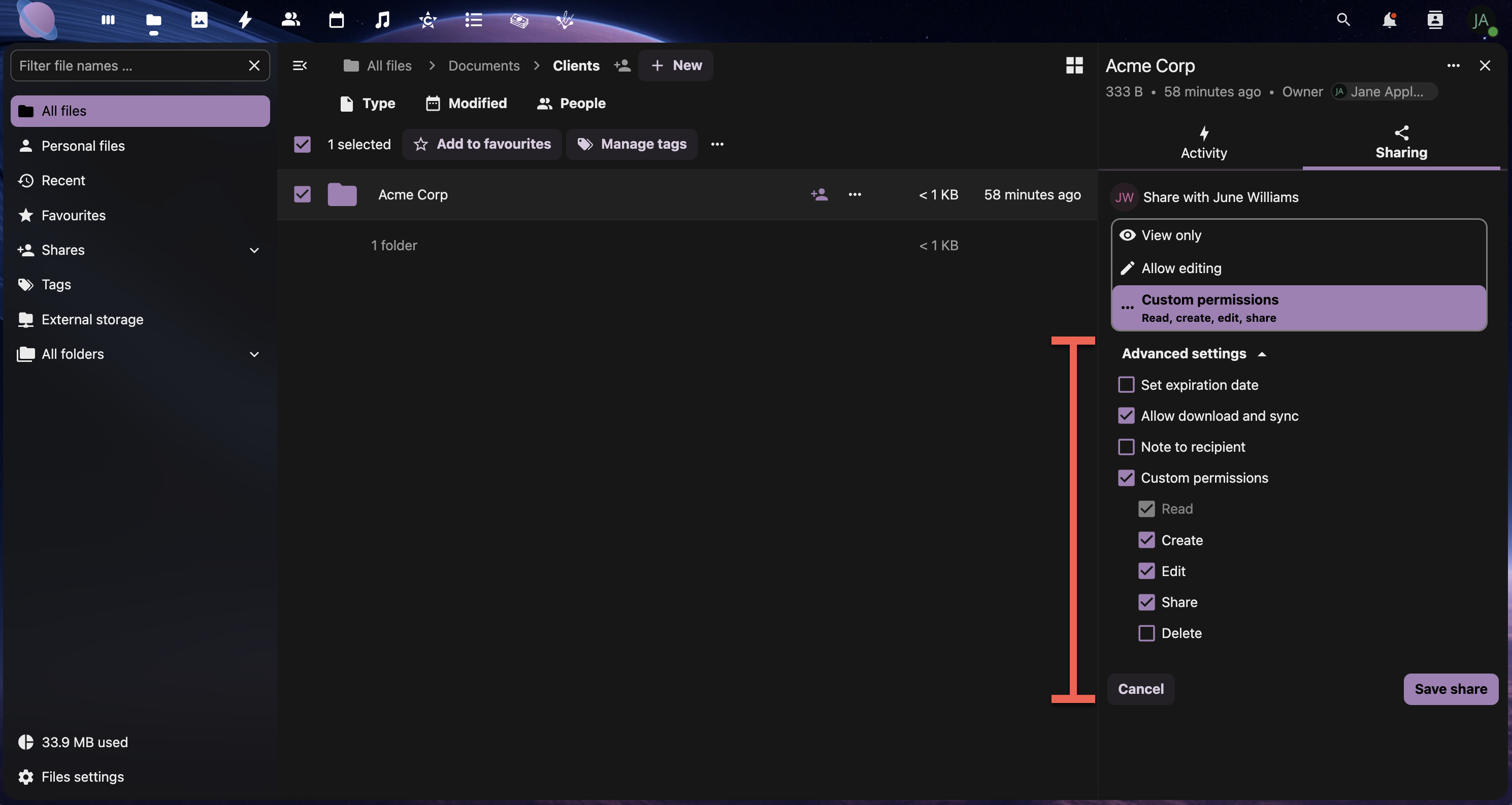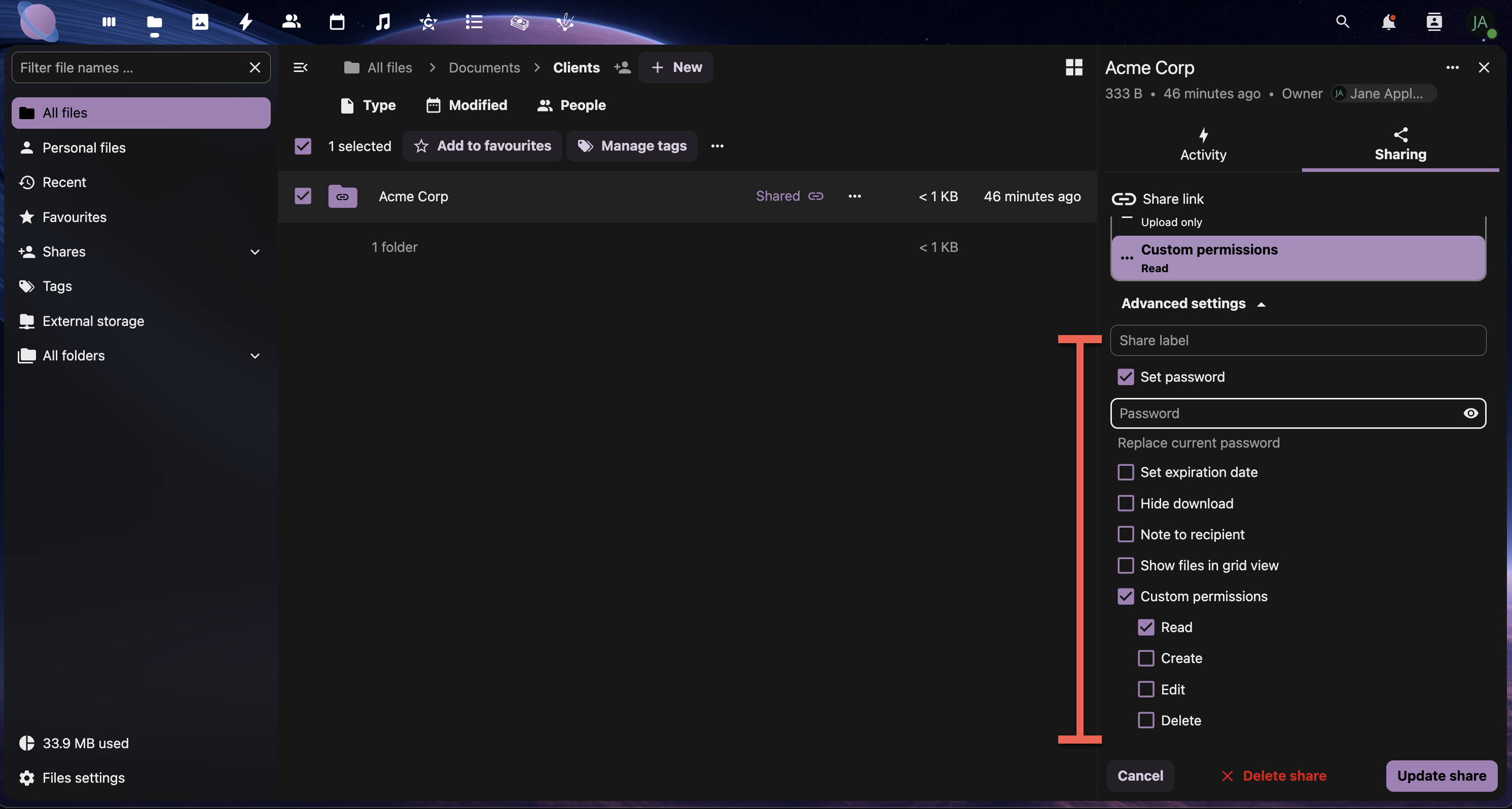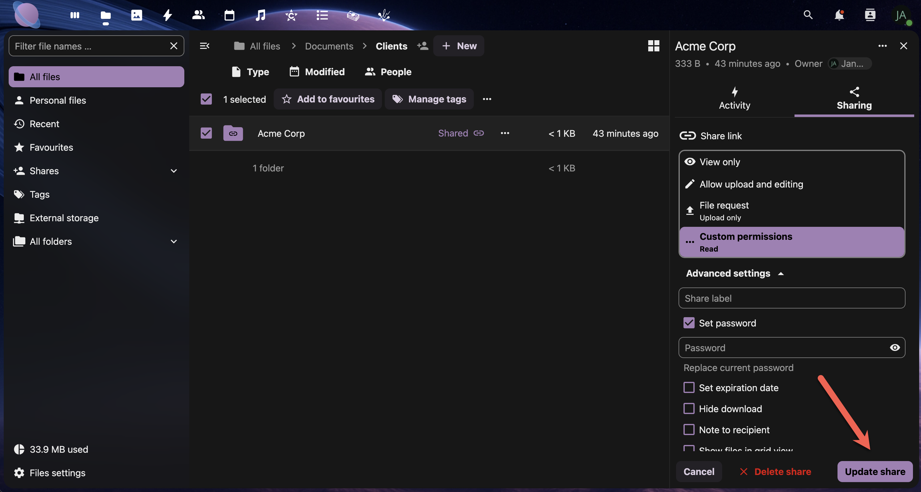 Next, select which options should be allowed with the public link. These options are explained in detail on the Custom Permissions for Public Shares. Please read this before sharing files publicly.